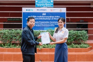 The ceremony was honored by the presence of Mr. Somphone Sisenglath, Director of EMI, and Mr. Vannakone Phongsisai, Director of Homsavanh School, who jointly presented the certificates.
